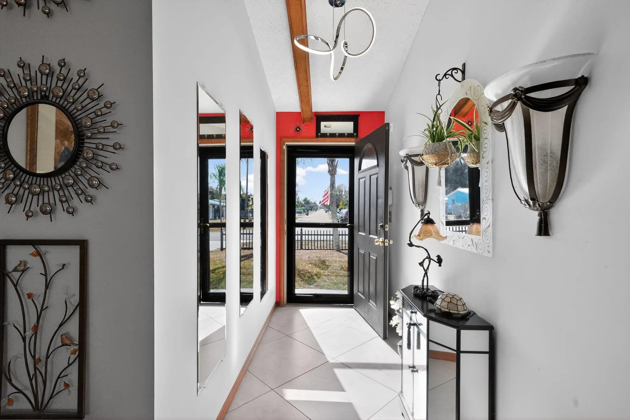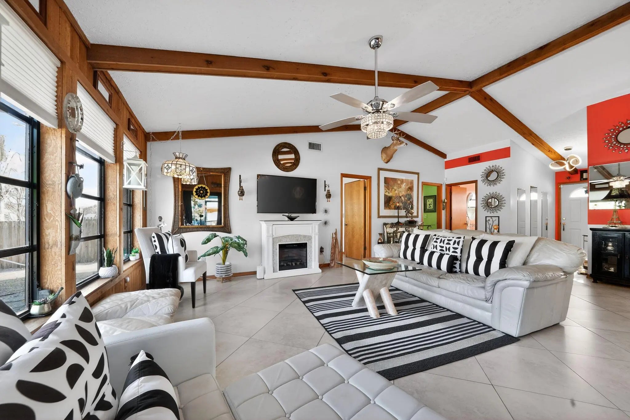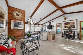 Welcome to a home that feels like a retreat from the moment you pull into the beautifully manicured front yard. Nestled in the highly sought-after Coral Gardens community of Stuart--renowned for its top-tier school system--this unique 2-bedroom, 2-bathroom residence with a garage offers an architectural character you won't find anywhere else in the area.Step inside to discover a warm, ''Up North'' cottage aesthetic featuring soaring cathedral ceilings, rustic cedar walls, and elegant lighting that creates an inviting glow throughout the open living space. The home flows seamlessly with diagonally laid tile throughout, leading you to the heart of the home: an open-concept kitchen designed to ensure you are always part of the conversation while entertaining.