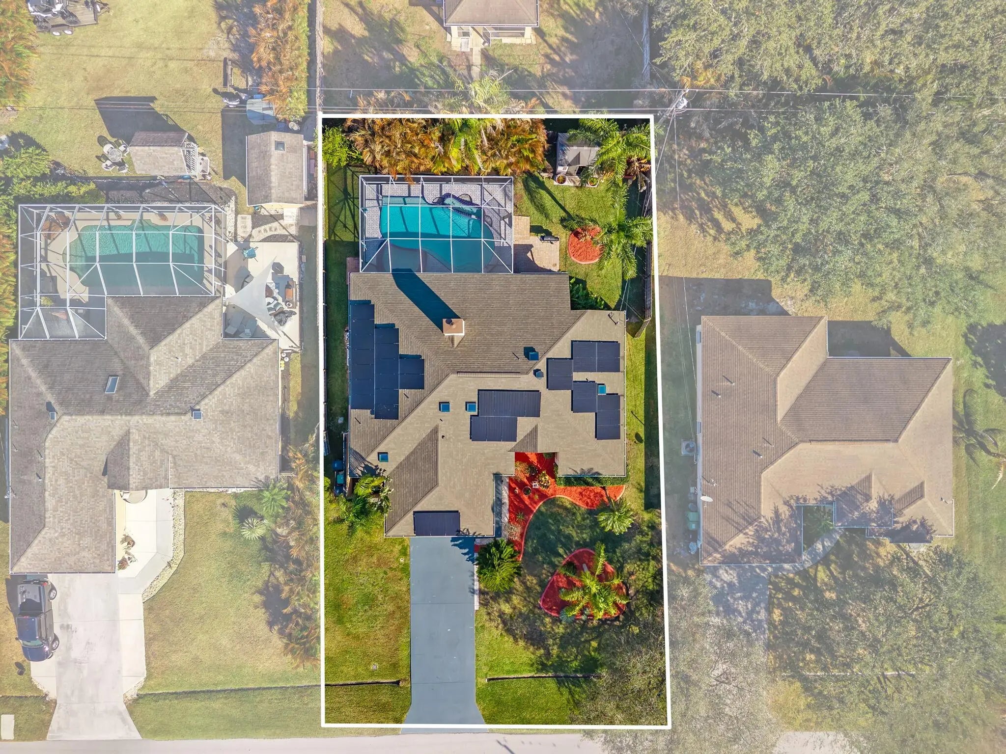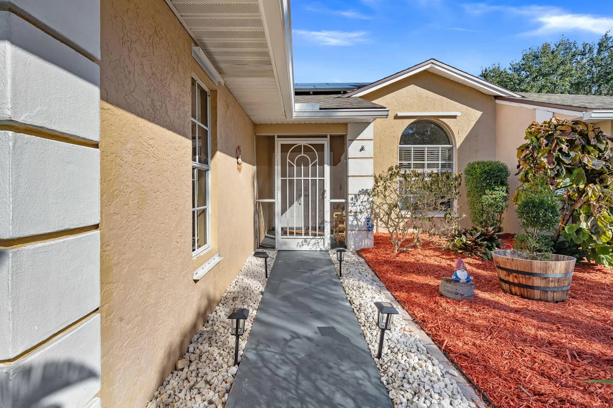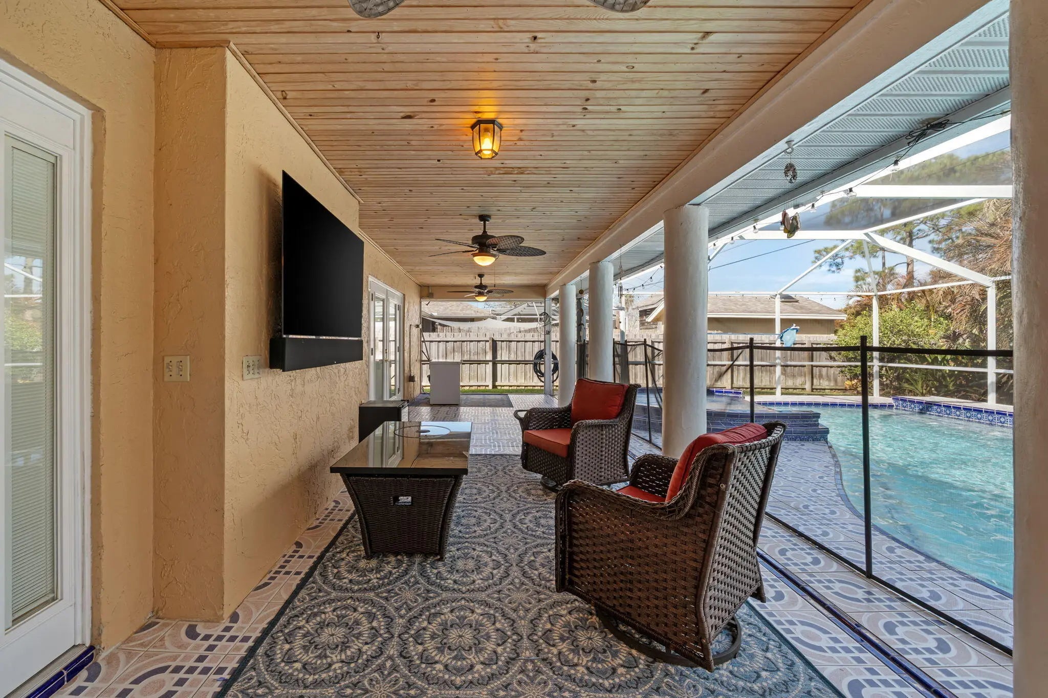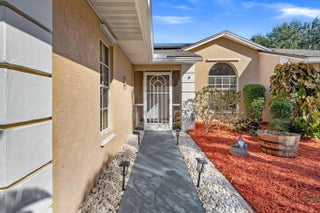 Experience the perfect blend of modern efficiency and coastal sophistication in this beautifully updated 3-bedroom, 2-bathroom sanctuary. Bathed in soft natural light from elegant skylights, the open-concept living area features sleek, popcorn-free ceilings and a cozy propane fireplace, creating an inviting atmosphere for both relaxation and entertaining. The gourmet kitchen is a designer's delight, showcasing rich granite countertops, a stunning custom backsplash, and refined under-cabinet lighting. Retreat to the expansive primary suite, where a spa-inspired ensuite awaits with dual vanities, artisanal tile accents, and a deep soaking tub.Step outside to your own private oasis, featuring a screened-in sparkling pool designed for the ultimate Florida lifestyle.