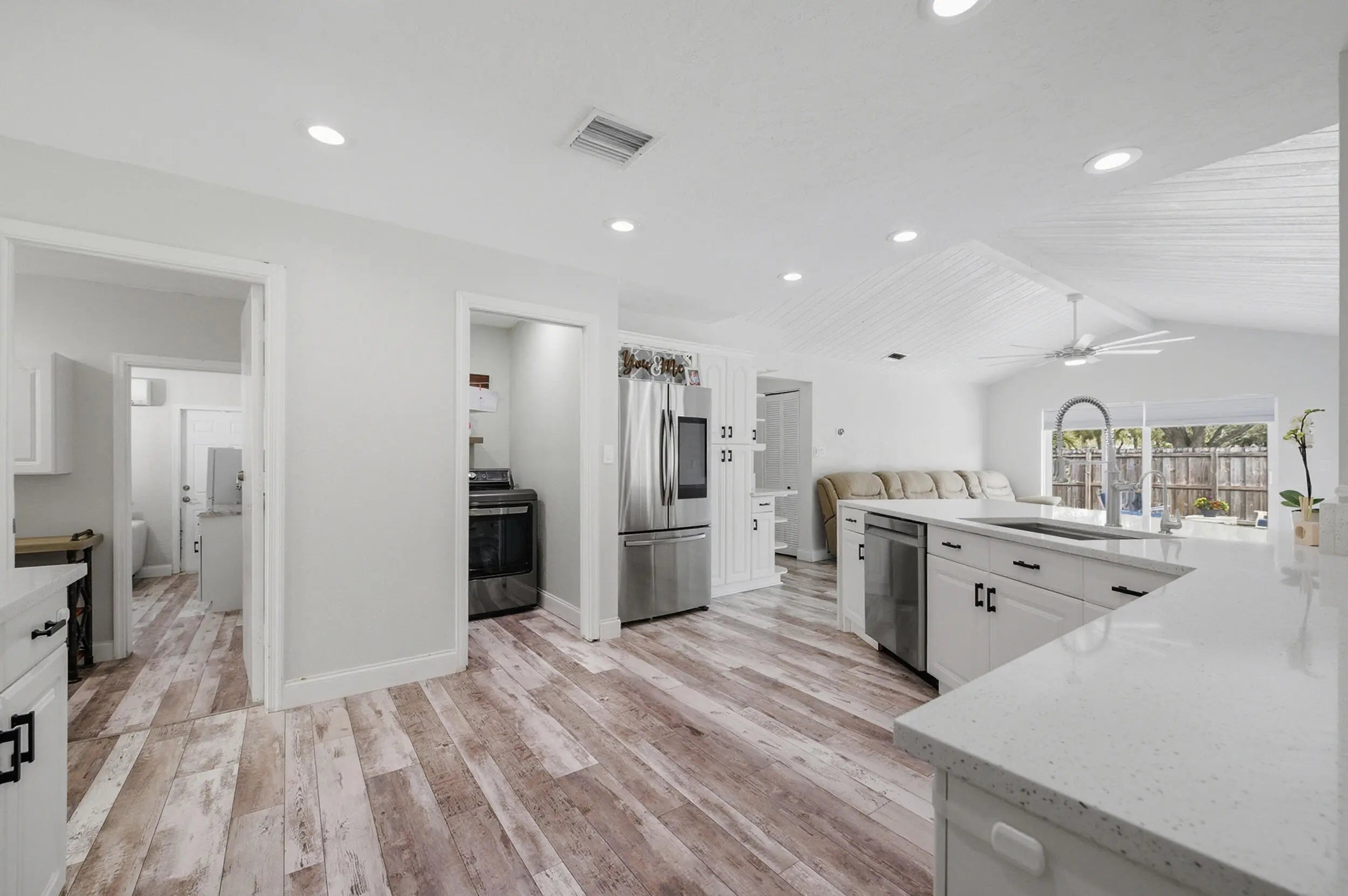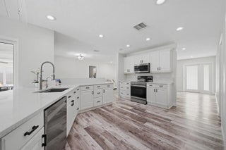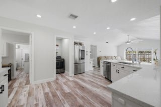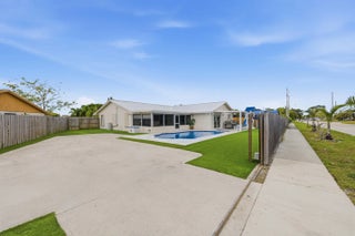 Stunning NO HOA corner lot home loaded with upgrades! Standing seam metal roof and new insulation 2024. Impact windows/ doors 2023. Updated electrical panel. 80 gal commercial WH 2023. Generator transfer switch for whole house. Backyard oasis with saltwater pool and spa with heater/chiller, RGB lighting, Azure blue resurface and Jandy equipment 2023, sandblasted marble deck, turf yard, outdoor shower, custom aluminum pergola with lighting. Screened 300 sf patio with roll down hurricane shutters. Electric 20 foot rear gate with remote, paved rear drive, 1250 sf slab, 30 amp RV hookup. Smart appliances 2024, Wi-Fi thermostat. Ethernet wired with IT rack, wired outdoor speakers, hardwired 4K cameras. Garage converted bonus suite with kitchenette, full bath, private entrance and AC.