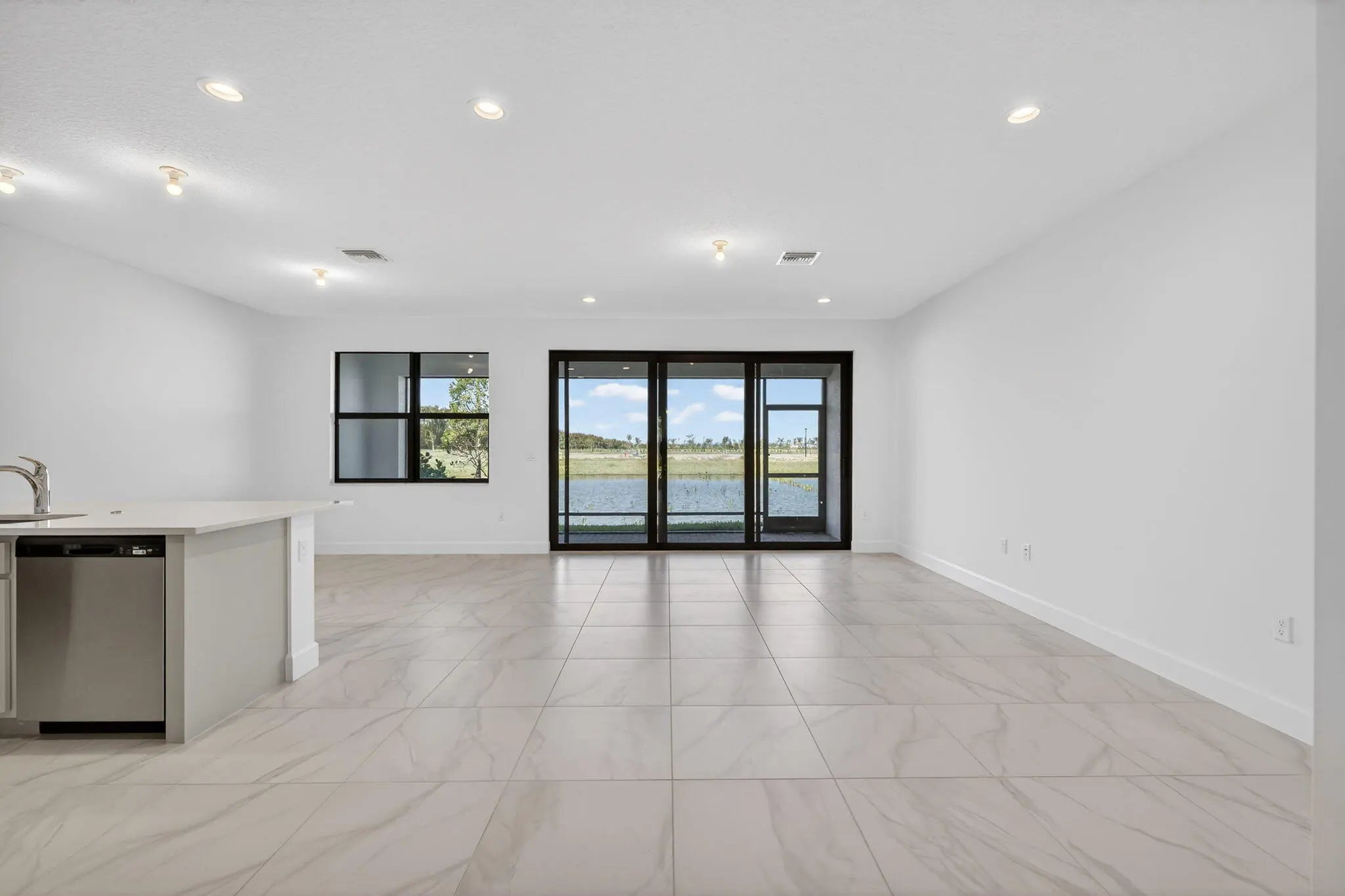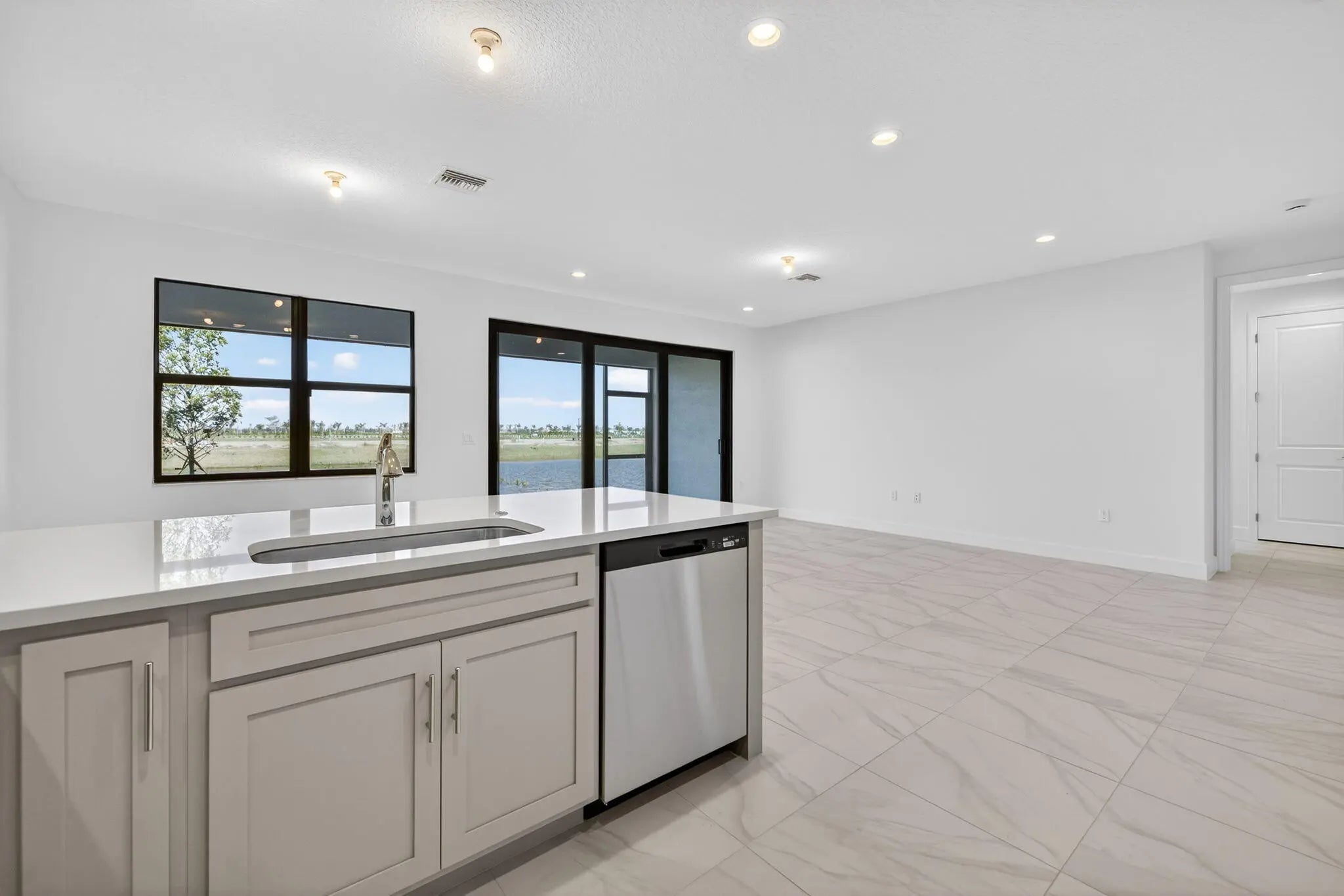 Valencia Parc at Riverland is where you'll find Port St. Lucie's best 55+ lifestyle with a million ways to have fun including a beautiful 38,000-square foot Clubhouse with resort-style amenities. This Sabal floorplan includes water views and an open floor plan with matte tile flooring throughout the entire home. The home features high end finishes including impact glass windows, GE gas appliances, tile roof, and recessed LED lighting. The kitchen includes quartz countertop with a full backsplash, painted grey mist maple cabinets, and GE stainless-steel appliances with a chimney hood. All bathrooms include high end quartz countertops and painted maple vanity cabinets. Valencia Parc offers access to the amazing facilities found throughout the 4,000 acres of master-planned amenities at