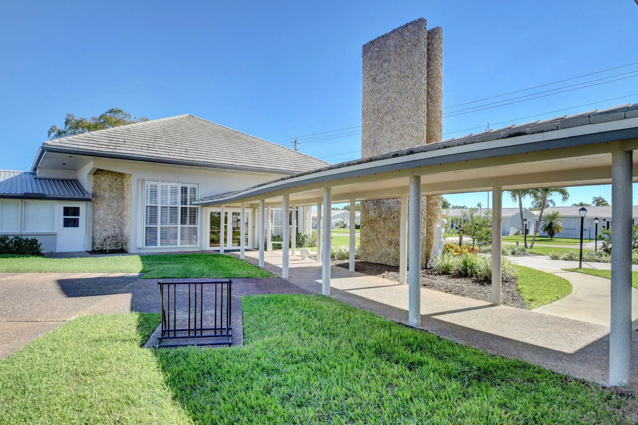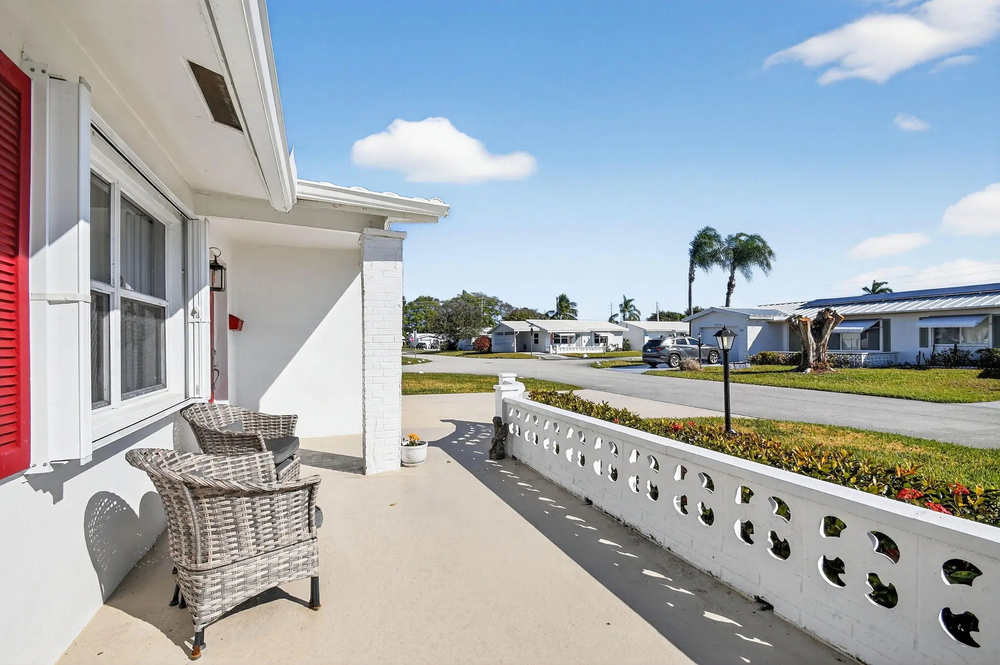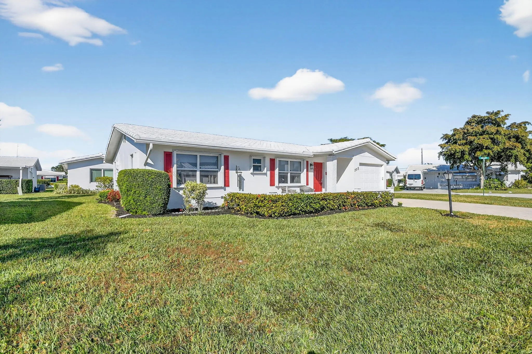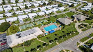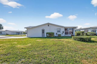 Pristine, turnkey (furniture optional) single-level CBS home ready for immediate move-in! This popular Regis model features 2 bedrooms and 2 updated bathrooms with a bonus glass enclosed Florida room on an oversized corner lot, ideally located close to one of the community clubhouses. Recent updates include a newly resealed two-car driveway (2025) and Class 5 accordion hurricane shutters for added peace of mind. Enjoy one of the lowest HOA fees in the area at just $187/month, covering lawn maintenance, exterior painting every six years, and power washing every two years. Community amenities include three clubhouses, three swimming pools, and a FREE 18-hole golf course, all conveniently located near shopping, dining, and major roadways.