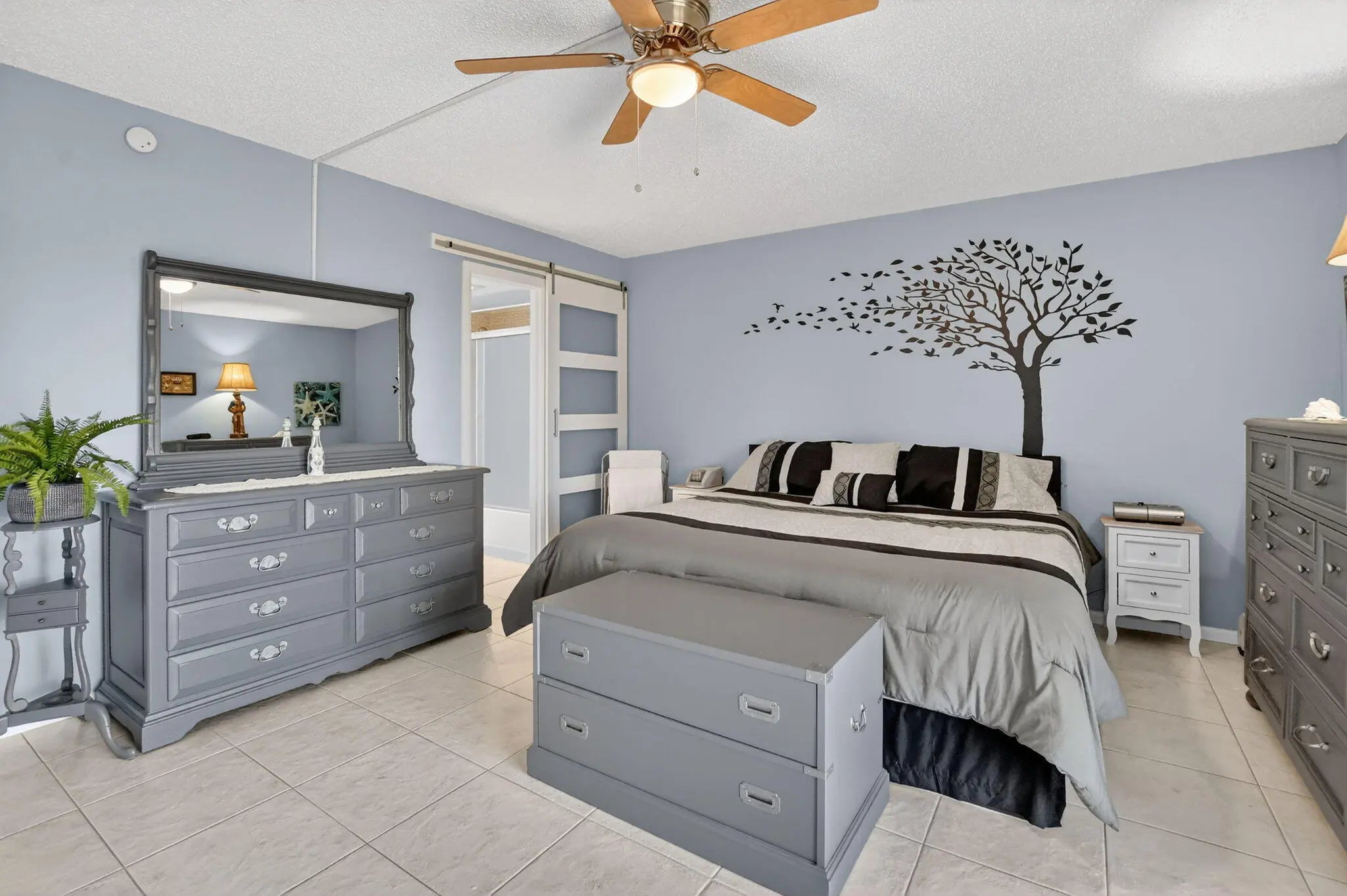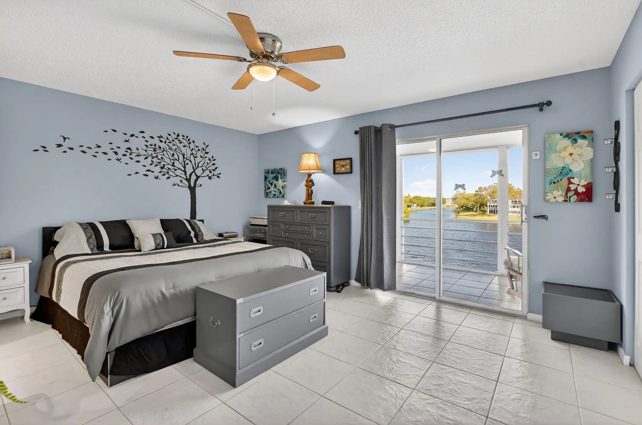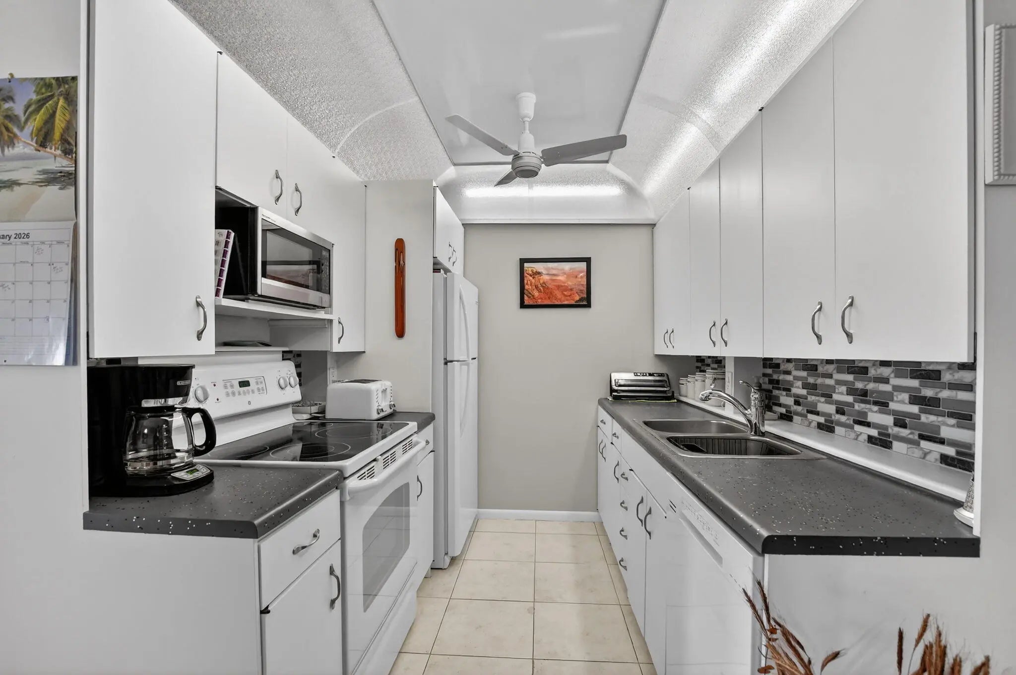 Beautifully maintained 1-bedroom, 1.5-bath fully furnished condo featuring a bright and airy layout with a stunning water view from the Florida room. The open kitchen showcases white cabinetry and matching white appliances, creating a light and inviting space. Ceramic tile flooring runs throughout the unit for easy maintenance and a cohesive look.This move-in ready, turnkey residence is filled with natural light and offers thoughtful updates including:A/C (2017), Dishwasher (2018), Refrigerator (2020), and Electrical Panel (2022).Located in a well-maintained building in a quiet setting within Century Village, a premier 55+ active resort-style community. Residents enjoy an abundance of amenities including clubhouse, fitness center, tennis, billiards, art classes,