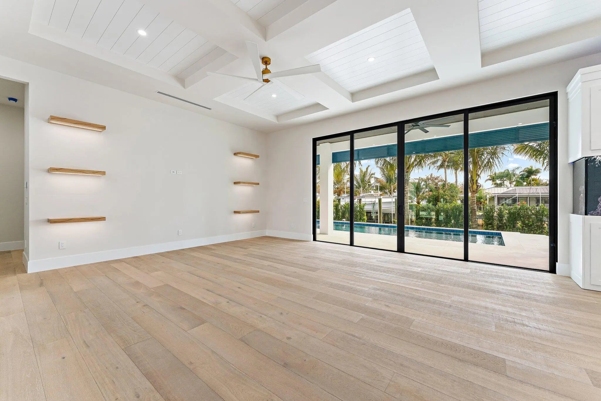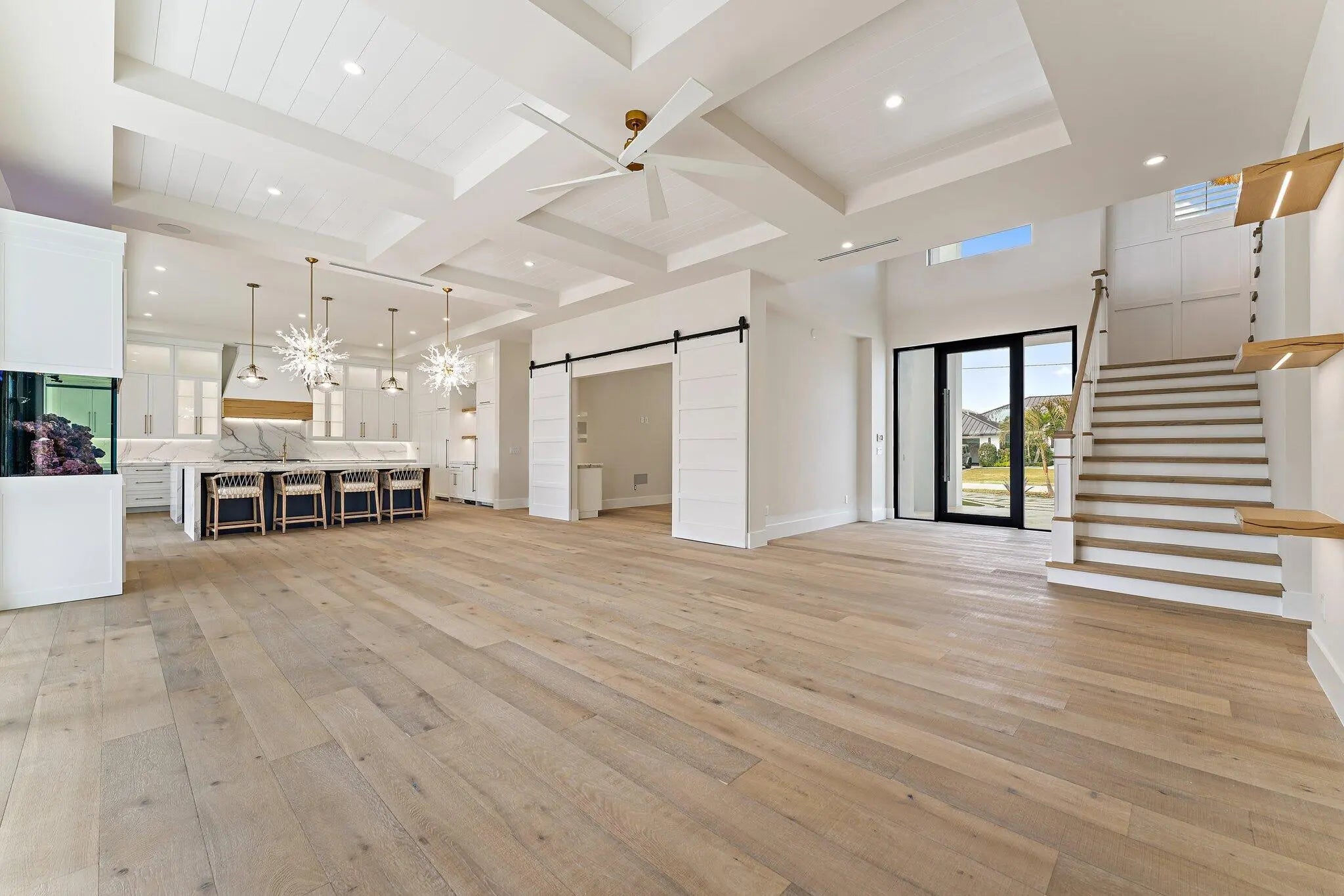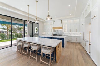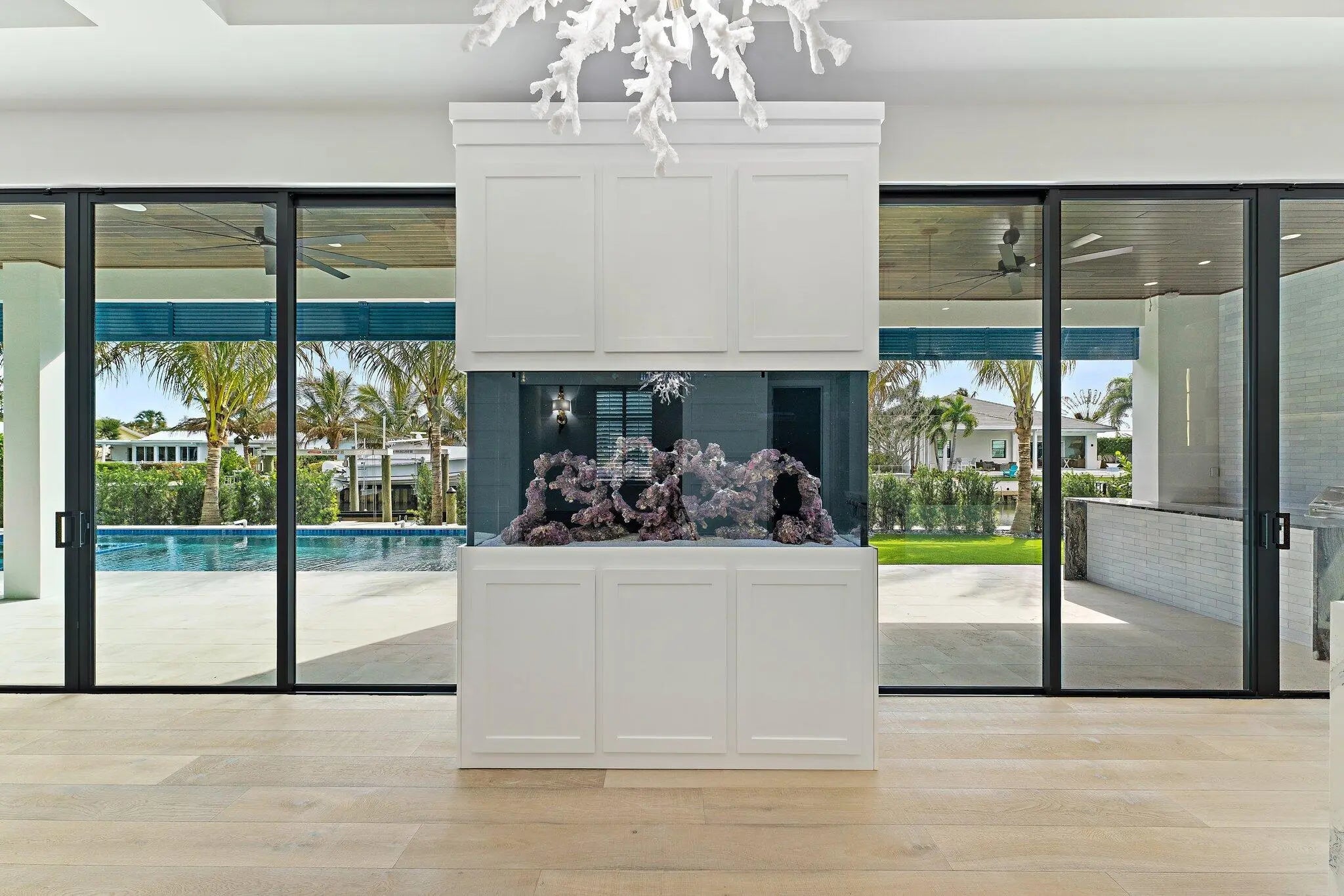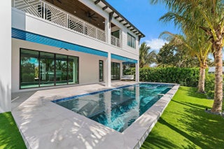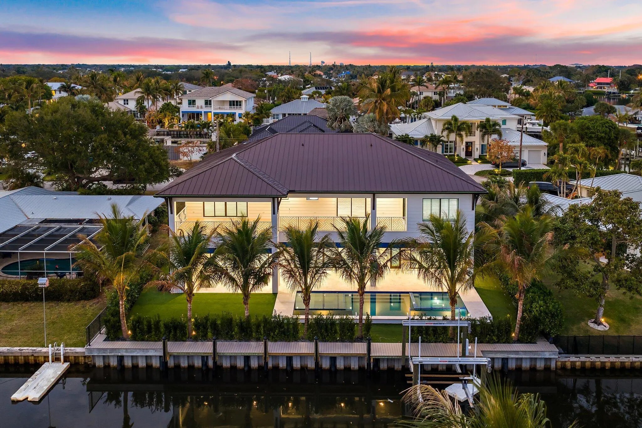 Newly completed in February of 2026, this waterfront estate home has it all. The main floor boasts a custom built-in aquarium in the great room; chef's kitchen with Sub-Zero and Wolf appliances and two islands, plus prep. Kitchen; home theatre room; three car garage (one bay is turned into a fitness center); powder room; and first floor guest suite. Wide plank oak floors throughout the main core of the home provide warmth and charm. The 2nd floor features an elevator; primary suite with two closets and huge primary bath; loft area with bar; two guest suites; and a large, covered balcony. The outdoor spaces feature custom pool with spa and water features; summer kitchen with BBQ; artificial turf back yard, and new dock with boat lift.