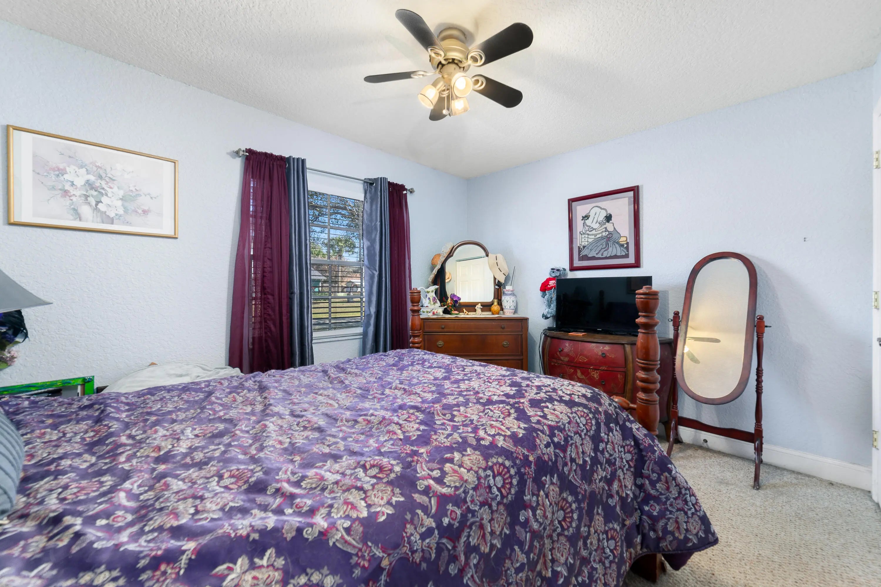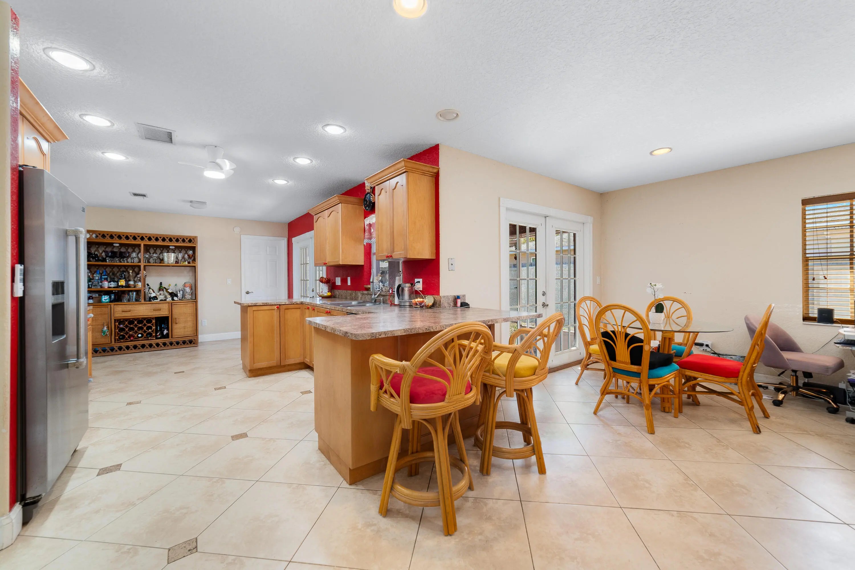 Situated on a fully fenced corner lot, this property offers added privacy, generous outdoor space, and dedicated parking for boats, trailers, or other toys securely stored behind the fence. The home is constructed of durable concrete block with a hip roof design and features updated hurricane shutters and an upgraded garage door for added peace of mind. A sprinkler system on well helps maintain the landscaping efficiently. Inside, tile flooring extends throughout the main living areas, creating a clean and cohesive look that is both durable and easy to maintain. The open floor plan offers excellent flow, with separate living and family rooms providing flexible spaces for both entertaining and everyday living.