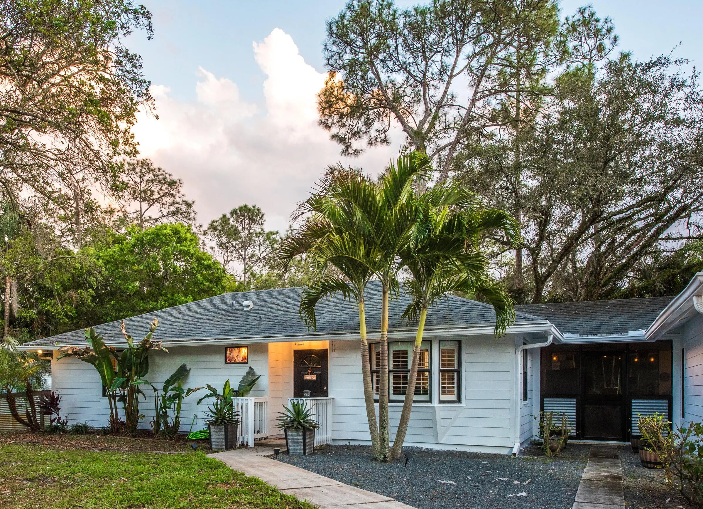 This turnkey property features a 3BR/2BA main home with an open-concept layout, vaulted ceilings, custom wood cabinetry throughout and a chef's kitchen with solid wood cabinets, quartz countertops, new or newer appliances. New flooring in many areas. Master suite offers a custom walk-in closet and a remodeled bathroom. Fresh interior/exterior paint, and new exterior siding. A 2023 roof, 2025 hurricane-impact windows, and new water heaters provide added peace of mind. The private guest house includes 2 bedrooms, 1 full bath, living room, dining area, and full kitchen with newer appliances, and a new washer and dryer--ideal for extended family or rental potential. The large screened-in patio opens to a spacious deck. Extra perks of the community include NO HOA and A-Rated schools.